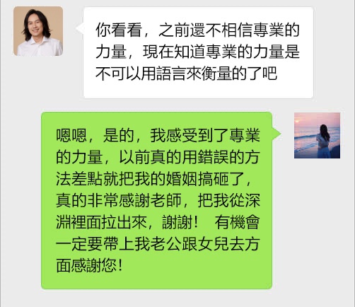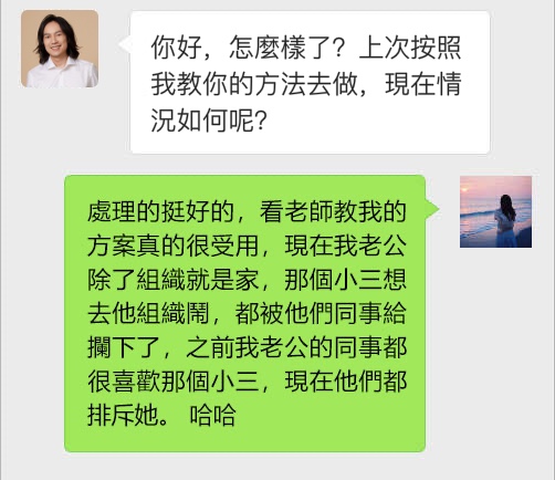如果妳還是不能平靜下來,那麼妳可以尋求專業的婚姻家庭諮詢師的幫助,專業的事情就交給專業的人去做,我會根據妳的情況具體的分析妳們的挽回成功率,並給妳出一套針對於妳的專屬方案